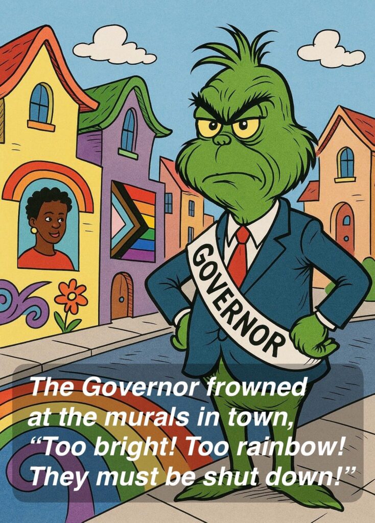 Andy Oliver and his congregation at the Allendale United Methodist Church posted their own version of Dr. Seuss’s The Grinch titled “The Parable of the Governor Who Tried to Steal Joy.” It opens with these lines: The Governor frowned at the murals in town, ‘Too bright! Too rainbow! They must be shut down!’”