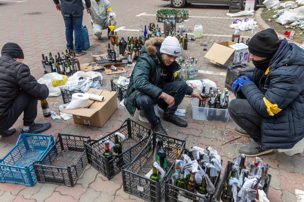 Passing through a door in a nearby building, I pass through a series of rooms crammed with Molotov cocktails— primitive incendiary bottle grenades filled with two-thirds gasoline and one-third engine oil. A strip of fabric that serves as a fuse is inserted into them. The Ministry of Defense of Ukraine regularly sends instructions via Twitter  on where to throw Molotov cocktails. In the case of a tank, the most vulnerable places are the air vents and optics. “Destroy! Burn! Cast the enemy out of your home, your country!” — wrote the Ministry of Defense of Ukraine.